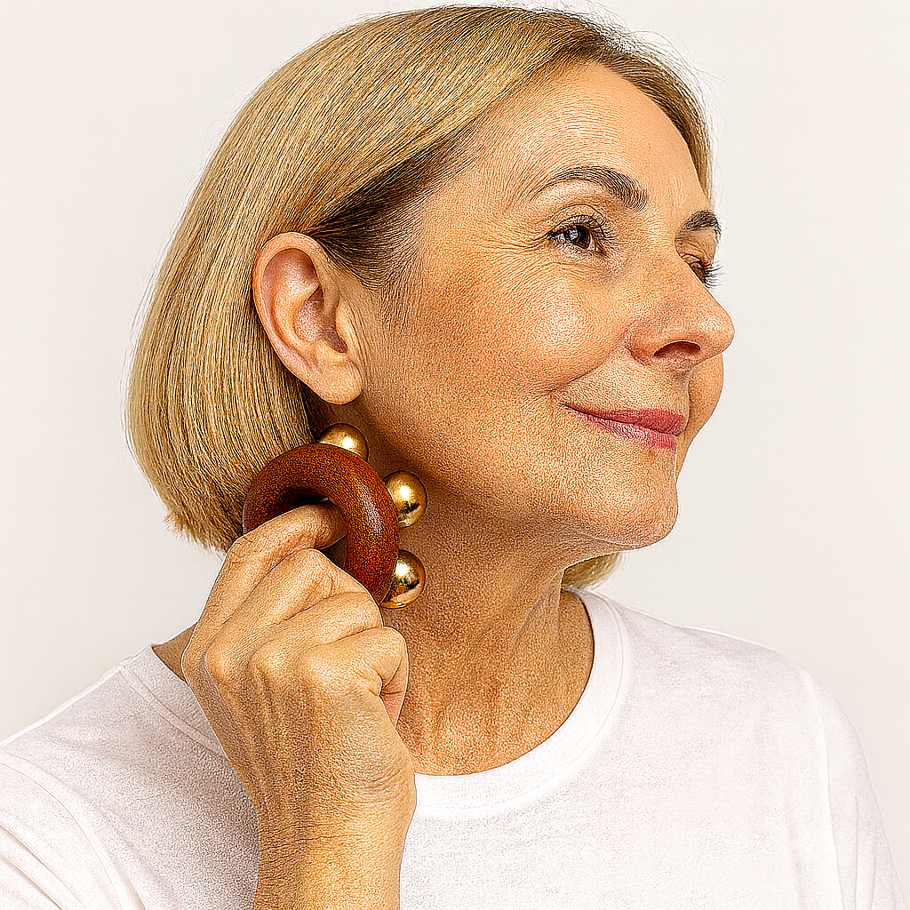 β€’ 🌿 Copper and Wood Meridian Massage Ring – palm-sized tool designed for lymphatic drainage, bloating relief, and tension release